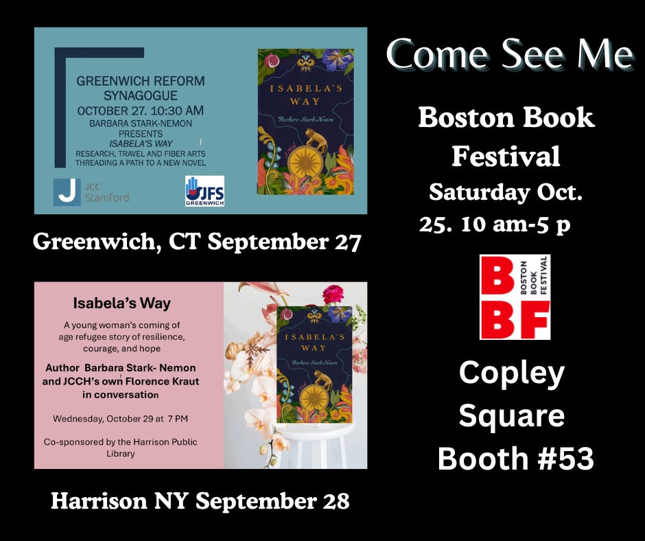It’s been a wonderful launch of Isabela’s Way so far, and next week I’ll be in Boston, Greenwich, CT and Harrison NY. Come and see me!!